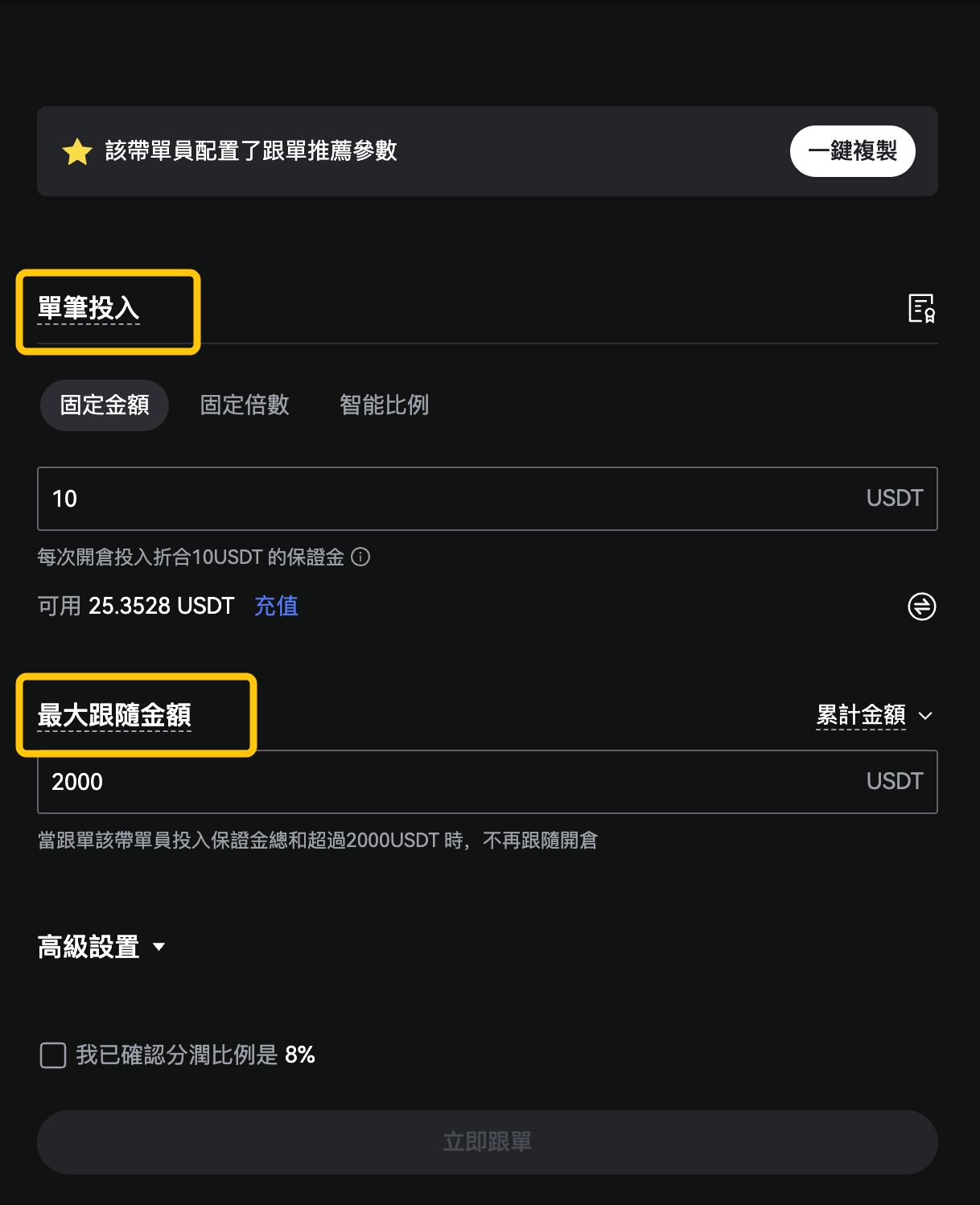 - 優化跟隨者跟單下單時投入保證金的計算邏輯,單筆投入參數優先級高於最大跟隨參數優先級。